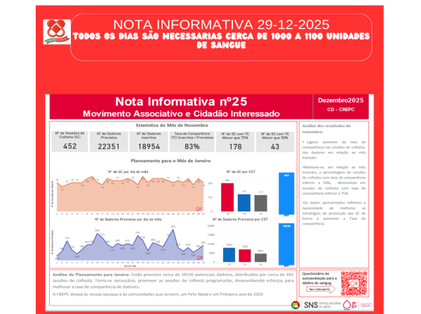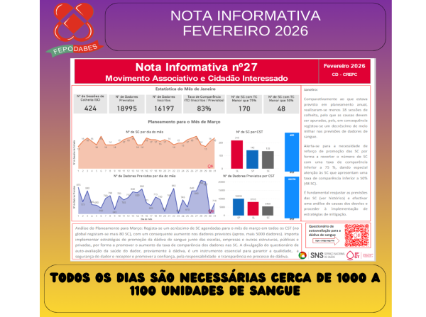 A FEPODABES – Federação Portuguesa de Dadores Benévolos de Sangue ao tomar conhecimento do Relatório de Atividade Transfusional e Sistema Português de Hemovigilância de 2024 e após leitura do mesmo e analise, verificamos que em 2024 houve uma diminuição de dadores e de dadivas por mil habitantes e também no que toca a dadores de primeira vez.No que se refere a distribuição por sexo, continua a registar um aumento no sexo feminino.A distribuição etária da população de dadores continua a registar o envelhecimento progressivo da população de dadores com aumento da idade média entre os 24 a 44 anos e de 45 aos 65 anos, e uma diminuição nos grupos etários entre os 18 e os24 anos e entre os 25 e os 44 anos. O Instituto Português do Sangue e da Transplantação, através dos seus três Centros colheu, no ano de 2024, 58,36% das dádivas nacionais (175 040), proporcionalmente o valor é semelhante ao do ano anterior, ligeiramente superior, fruto do trabalho, dedicação e resiliência das Associações /Grupos e Núcleos de dadores de Sangue e dos profissionais de saúde do IPST IP. Posto isto no nosso entender é urgente, alterar algo na dadiva de sangue, mais incentivos, mais promoção, melhor planeamento, mais profissionais de saúde afim de fazer face a muitos pedidos de realização de colheitas de sangue e diminuição do tempo de espera nas sessões de colheitas de sangue, alteração de horários de atendimento aos dadores nomeadamente nos hospitais.