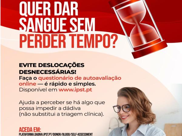 No âmbito da promoção da dádiva de sangue segura e responsável, encontra-se disponível um Questionário de Autoavaliação para a Dádiva de Sangue.Este instrumento, não substitui a triagem clínica realizada por um Profissional de Saúde Qualificado, tem como finalidade esclarecer previamente os candidatos à dádiva de sangue sobre a sua elegibilidade, com base nos critérios clínicos e legais em vigor, permitindo identificar algumas situações de suspensão temporária ou definitiva.Ao preencher o questionário, cada candidato poderá:Obter uma orientação prévia quanto à sua aptidão para dar sangue;Evitar deslocações desnecessárias;Contribuir para uma gestão mais eficiente dos recursos disponíveis. ➡️ Aceda ao questionário através de:https://plataforma.dadiva.ipst.pt/donor/blood/self-assessment